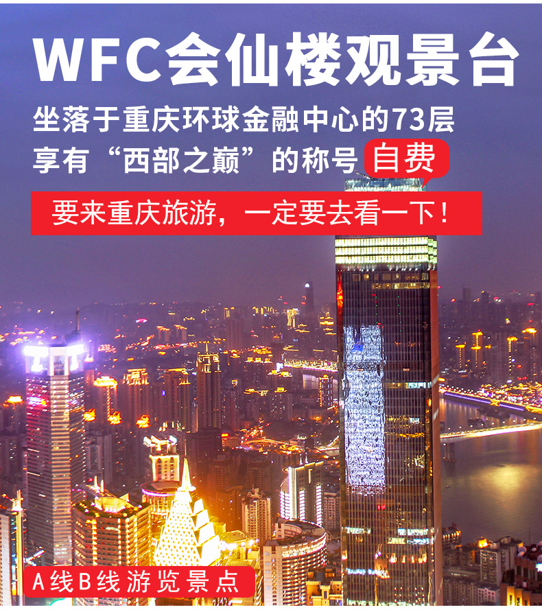 ● 可根據(jù)自己喜好參加中國西部第一高樓【W(wǎng)FC 觀景臺(tái)】(自費(fèi))俯瞰重慶兩江四岸風(fēng)光,高空 360 度看山城,享受城市的專屬視角,海拔高度 590 米,其中 74 層為全露天設(shè)計(jì),四周全是玻璃幕墻,游客可在此俯瞰兩江四岸,仰望璀璨星空,感受與眾不同的奇趣魅力。