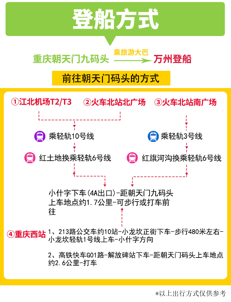 下午14:00游客自行前往朝天門九碼頭三岔路口集合乘車。