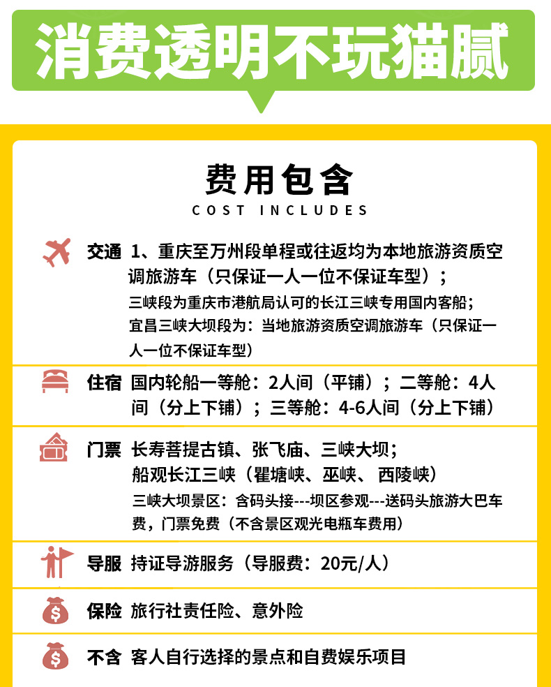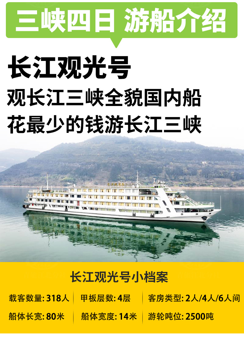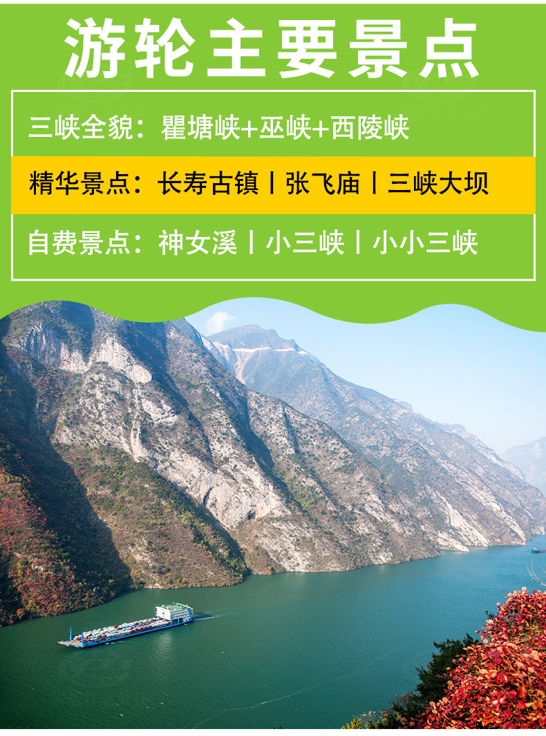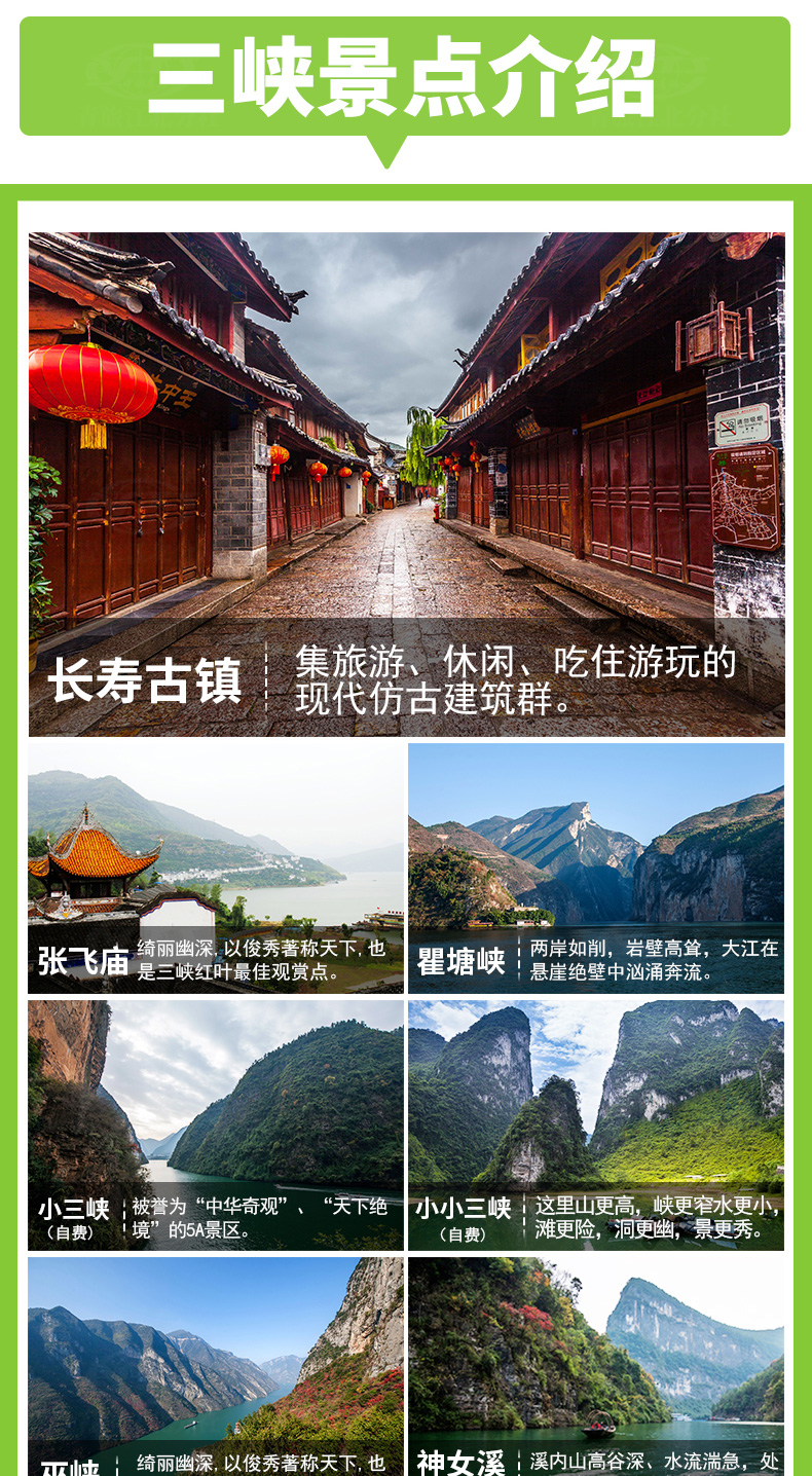 3、包含景點: 長壽菩提古鎮(zhèn)、、張飛廟、三峽大壩;長江三峽(瞿塘峽、巫峽、 西陵峽);三峽大壩景區(qū):含碼頭接---壩區(qū)參觀---送碼頭旅游大巴車費,門票免費(不含景區(qū)觀光電瓶車費用)