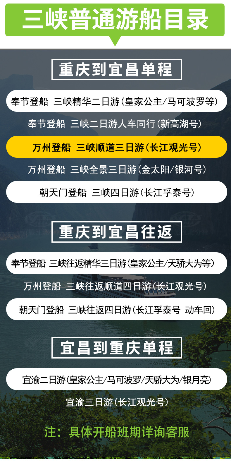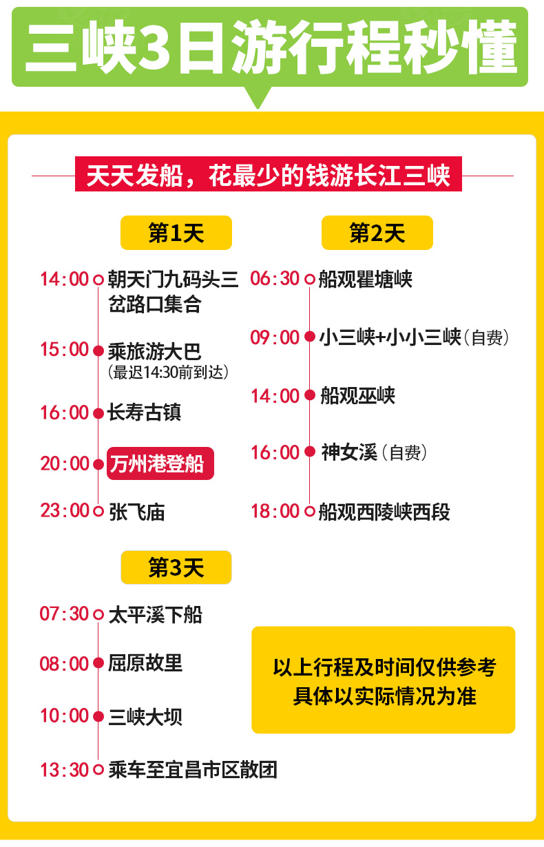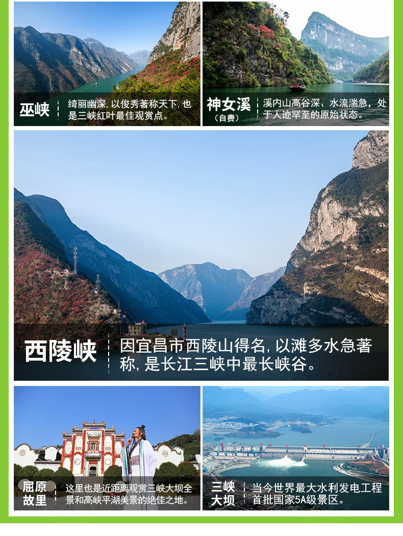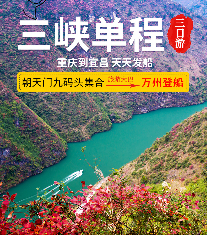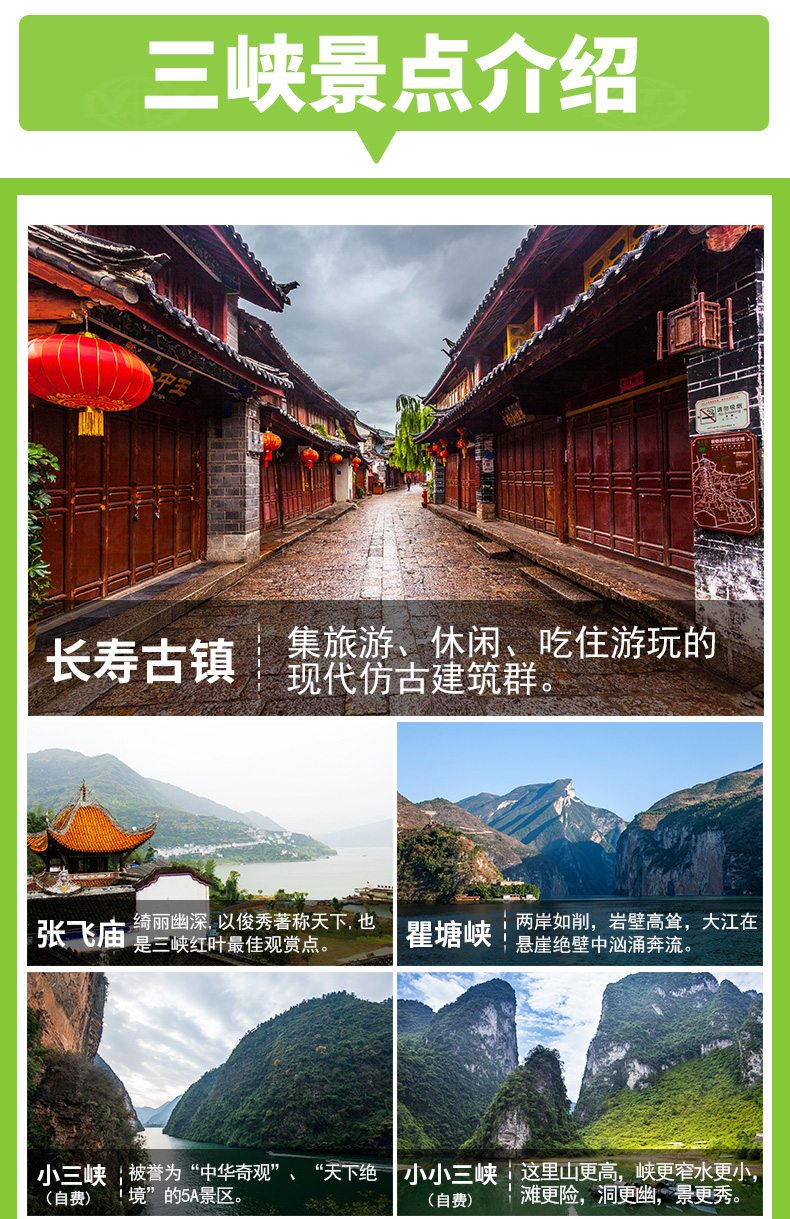 3. 包含景點(diǎn):長壽菩提古鎮(zhèn)、張飛廟、屈原故里、三峽大壩;船觀長江三峽(瞿塘峽、巫峽、 西陵峽)。