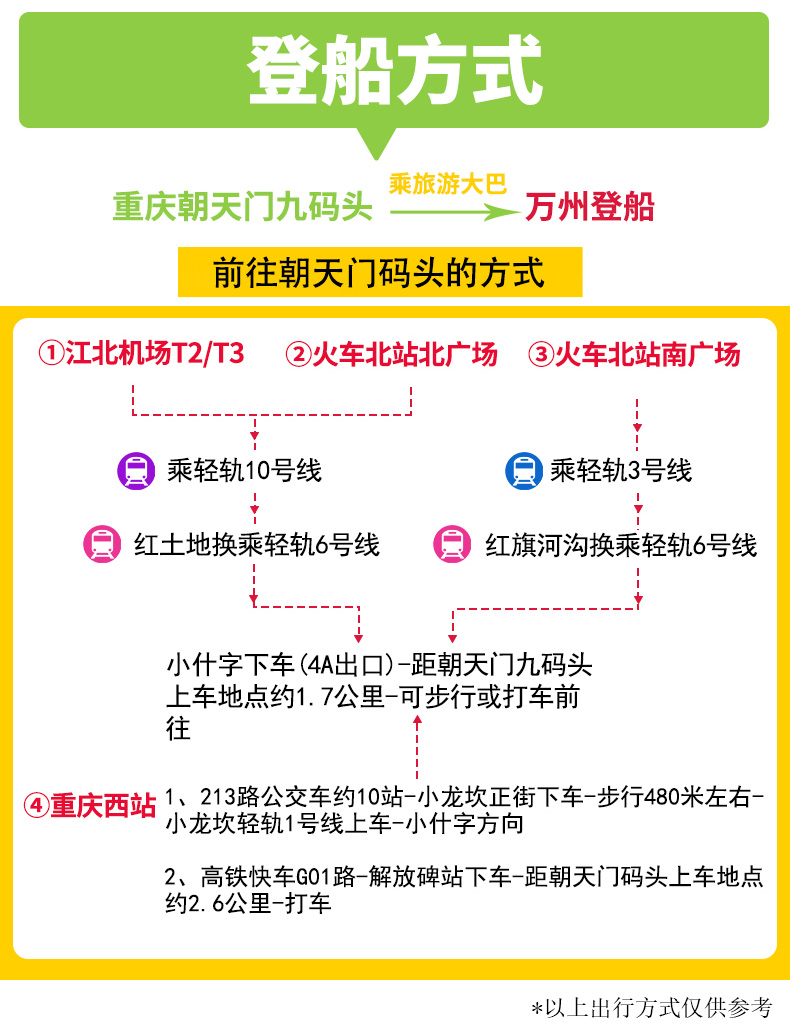 1、區(qū)間交通:重慶至萬州段單程或往返均為本地旅游資質(zhì)空調(diào)旅游車(只保證一人一位不保證車型);三峽段為重慶市港航局認(rèn)可的長江三峽專用國內(nèi)客船。宜昌三峽大壩段為:當(dāng)?shù)芈糜钨Y質(zhì)空調(diào)旅游車(只保證一人一位不保證車型)。