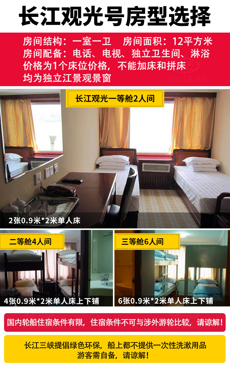1、長江三峽國內(nèi)游船艙位分為:一等艙、二等艙、三等艙,輪船公司按游客實(shí)際購買艙位進(jìn)行安排艙室及床位,在不影響游覽行程的情況下,輪船公司工作人員有權(quán)合理安排床位。如:二等艙3人過多,工作人員為保證所有乘船游客的順利游覽(一人一床位),可打散部分二等艙3人一行的客人,即不一定安排在同一艙室,但保證為相鄰房間。
